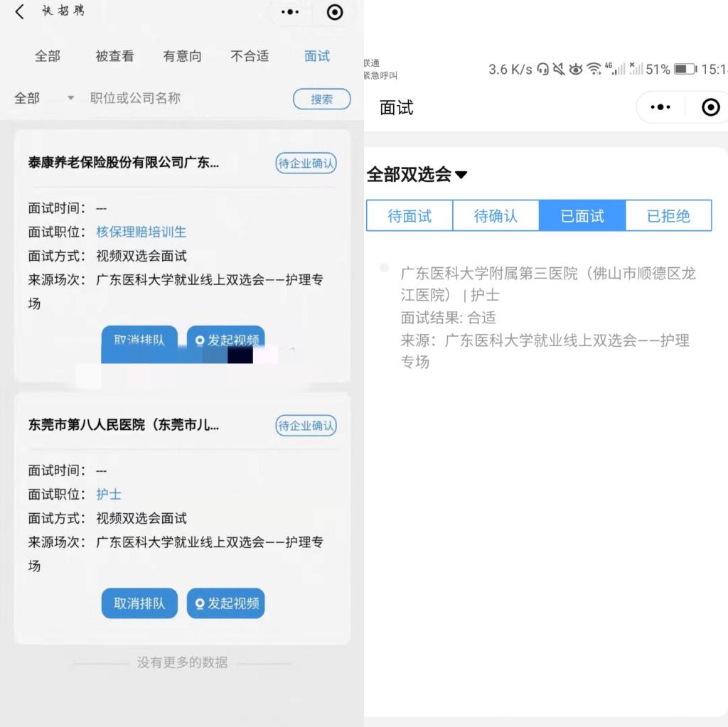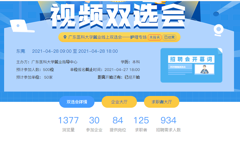 本次护理专场线上视频双选会有参会单位30家,包括广东医科大学附属第三医院(佛山市顺德区龙江医院)、湛江市第二人民医院、肇庆市第三人民医院等10家医院,东莞市大参林连锁药店有限公司、泰康养老保险股份有限公司等20家企业。共提供岗位84个,招聘需求人数934人,求职者125人,浏览量达1377次,经过简历筛选、视频面试,最终面试合适27人,有意向29人。