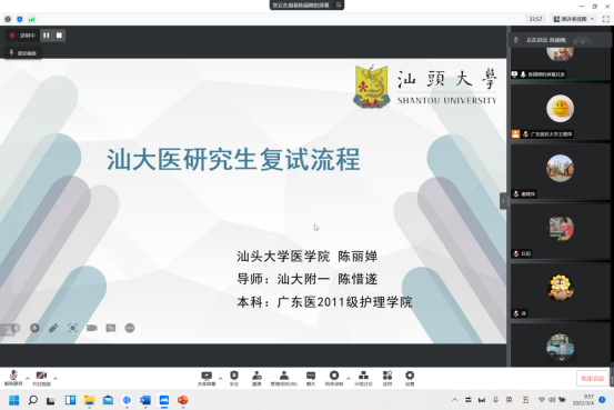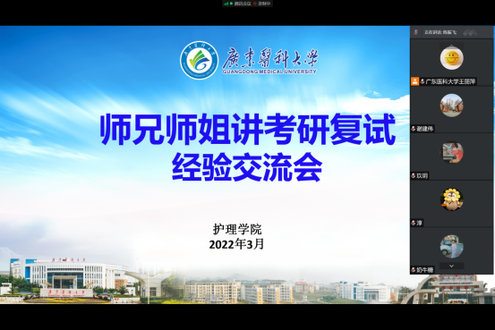 10位往届同学分别来自中国医科大学、南方医科大学、汕头大学、暨南大学、广州中医药大学、澳门科技大学、广州医科大学、广东药科大学和广东医科大学。交流会中,师兄师姐依次根据自己报读学校的复试情况向师弟师妹详细讲解了复试特别是线上复试的流程和注意事项,包括英语面试应对技巧及联系导师注意事项、调剂注意事项等,为正在准备硕士研究生复试的同学们分享经验、指点迷津。