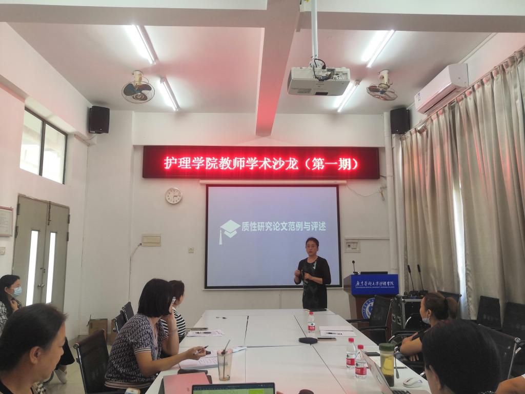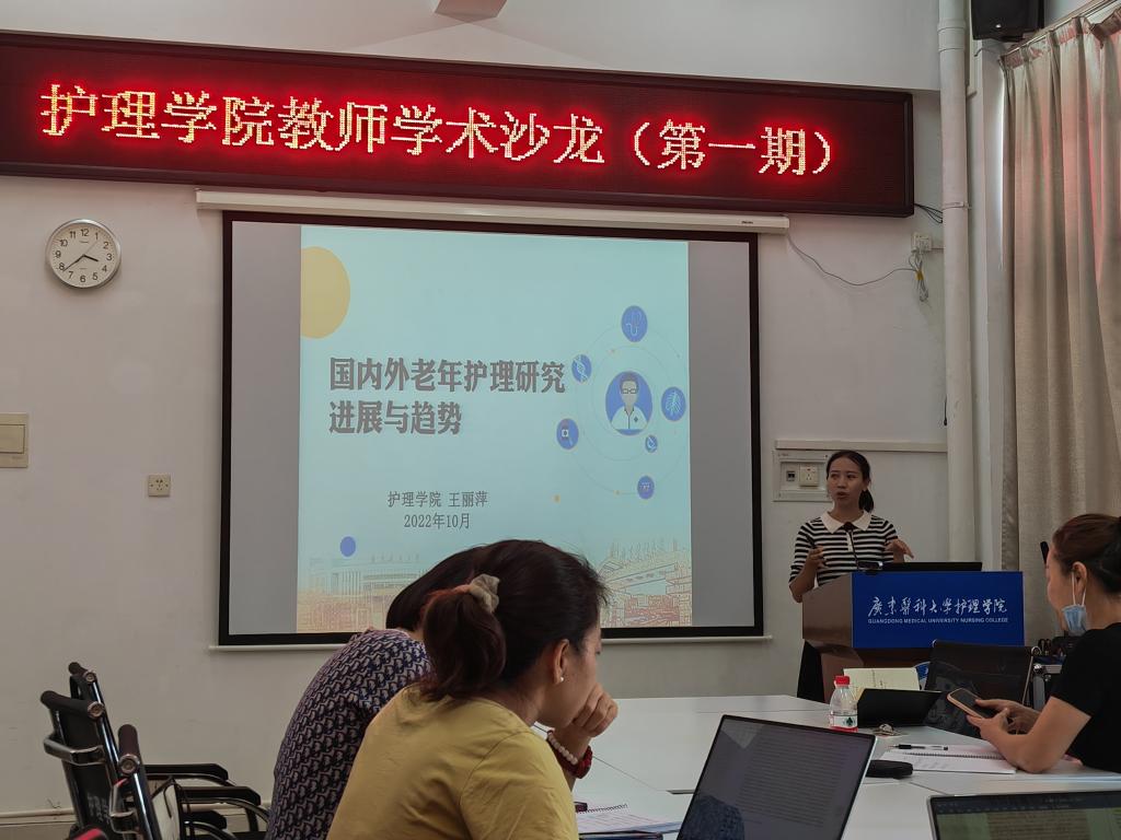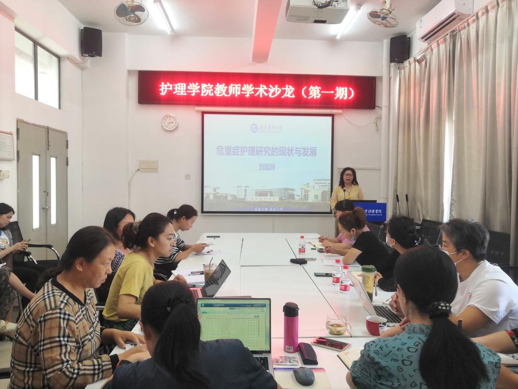 首先,刘琼玲院长先强调了开展学术沙龙的目的和意义,要求学院全体教师积极参与学术沙龙活动,希望每位教师能结合自己的研究方向,认真查阅相关文献,提前准备好学术沙龙交流的内容,以便大家在交流中碰撞出科研的火花,进一步明晰自己的研究方向,不断提升自身的学术科研能力。随后,刘院长以“危重症护理研究的现状及发展”为题,具体从危重症护理学的概念与意义、危重症护理的发展与目标后,重点围绕疼痛的评估与护理、镇静的评估与护理、营养的评估与护理、活动能力的评估与护理、并发症的预防与护理和循证护理6个方面介绍危重症护理的研究进展。