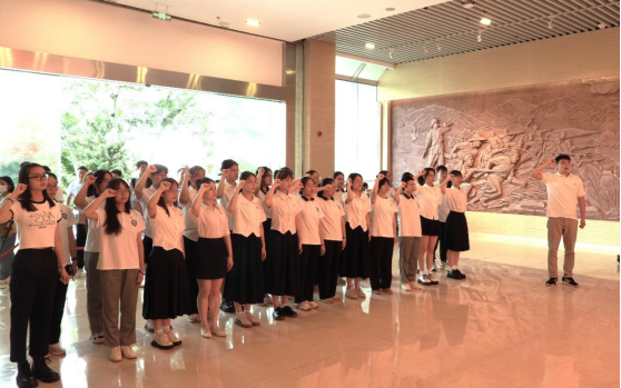 随着参观讲解结束,全体成员返回大厅举行入党宣誓仪式,李瑞琦老师领誓。刘艺老师和毕业生党员为即将下点实习党员佩戴党徽,在革命先烈的见证下,BB贝博艾弗森官方网站学生党员完成了新老传承。