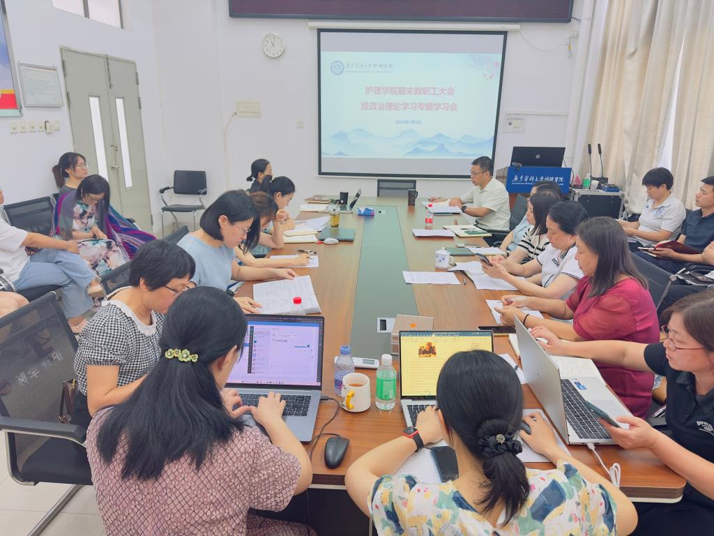会上,学院分管领导、各系室分别就上半年工作进行总结和对下半年工作进行部署。本学期以来,学院新领导班子坚持党建引领凝聚发展合力,扎实开展党纪学习教育,落实立德树人根本任务,以护理学专业认证为统领,扎实推进人才培养、教学改革、科研创新、就业工作等中心工作,取得了较好成绩。最后王辉群对全体教职工在本学期工作所取得的成绩表示感谢,针对存在问题要剖析原因,继续努力,强调全体教职工要加强学习,增强团结,严守纪律,勇于担当,扎实推进学院高质量发展。