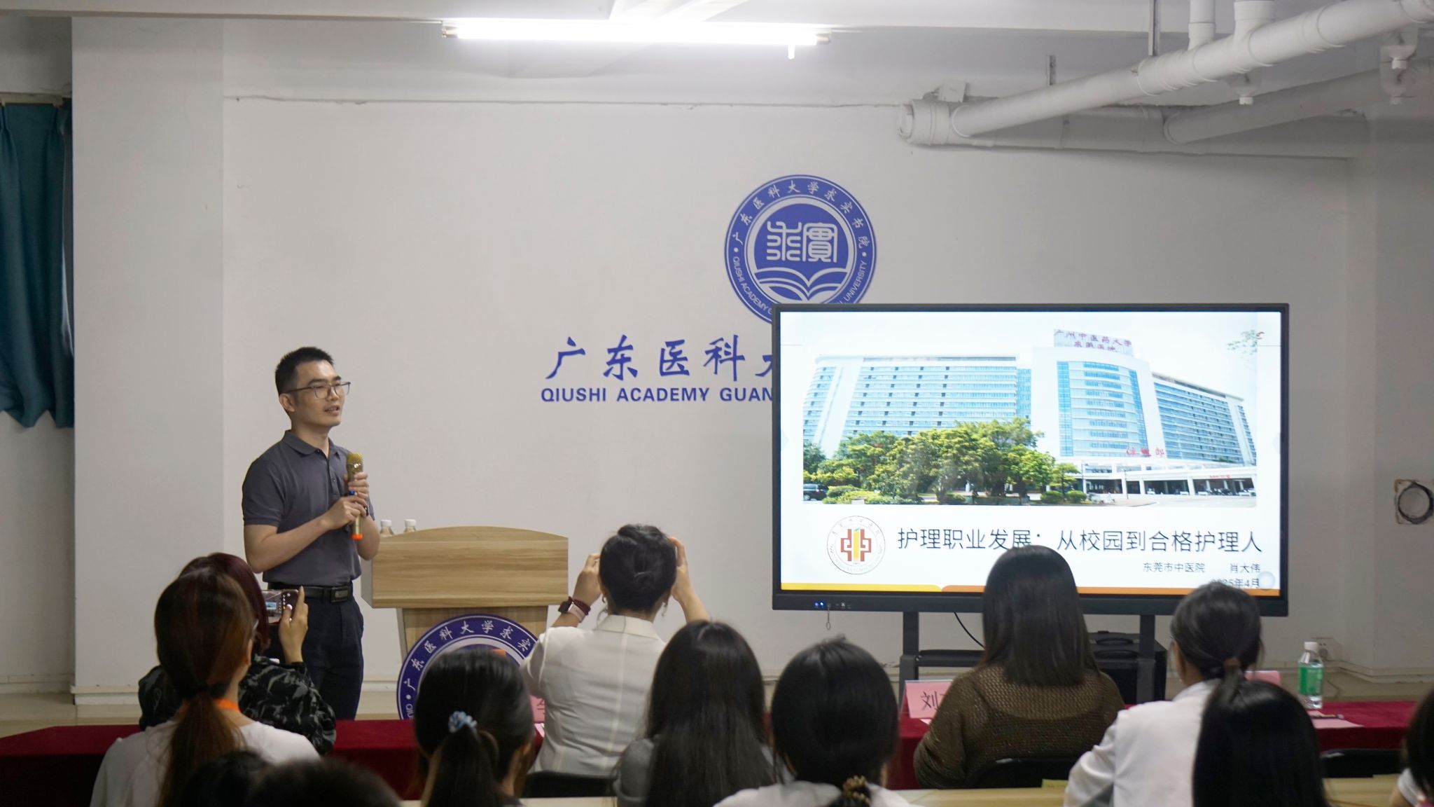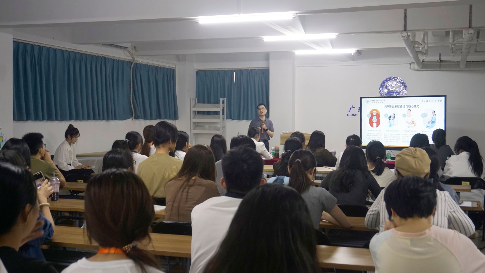 肖大伟以《护理职业发展——从校园到合格护理人》为题,结合自身经历,从护理行业发展现状和未来趋势、本科生差异化竞争力塑造和职场生存法则三个方面进行分享。以优势学历对线策略和黄金科室选择矩阵为切入点,剖析如何结合自身特点提升就业竞争力。他鼓励同学们掌握职场生存法则,运用压力熔断机制和职业幸福感密码,纾解自身压力,以饱满的精神状态投入临床工作。