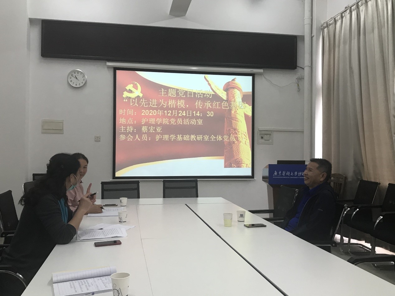 护理学基础教研室党支部于2020年12月24日下午开展了“以先进为楷模,传承红色基因”主题党日活动。校党委副书记、纪委书记向献兵同志以普通党员身份参加了此次活动,活动由支部书记蔡宏亚主持。