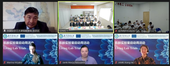 2022年6月6日起,由BB贝博艾弗森官方网站主办、欧盟GeNEdu项目资助的“广东医科大学欧盟GeNEdu项目乐龄实验室”启用周拉开帷幕。芬兰于韦斯屈莱应用科技大学护理学位项目主任、GeNEdu项目学术经理Marjo PALOVAARA、全球教育服务部经理、GeNEdu项目执行经理何翔、康复专业教授Kari VEHMASKOSKI、护理专业副教授 Marina HIRJABA以及中国驻芬兰大使馆教育组负责人孙洪志教授、芬兰国家商务促进局华南地区代表、高级顾问李俊英女士分别在线上线下出席会议,广东医科大学党委书记、校长卢景辉,国际交流与合作处处长郭绍波,相关医院专家代表、BB贝博艾弗森官方网站党政班子及全体老师和参加本项目的学生出席了开幕式活动。